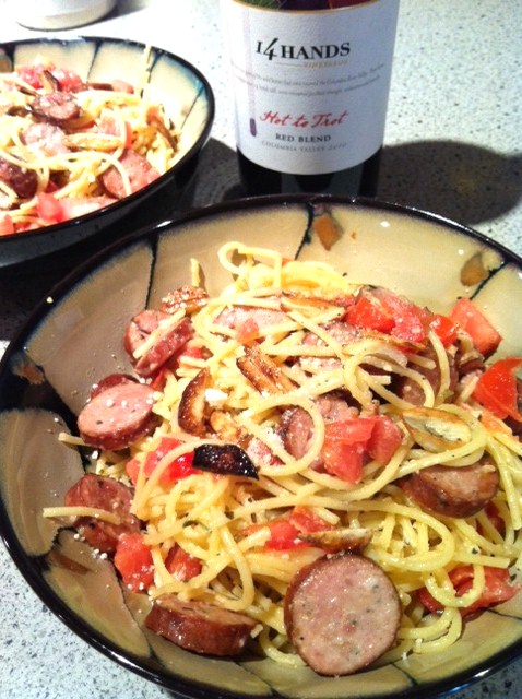 Meanwhile, in a large pan, fry garlic in drizzle of oil. Add thinly sliced sausage (or crumbles) and let brown. Make sure garlic is tender.